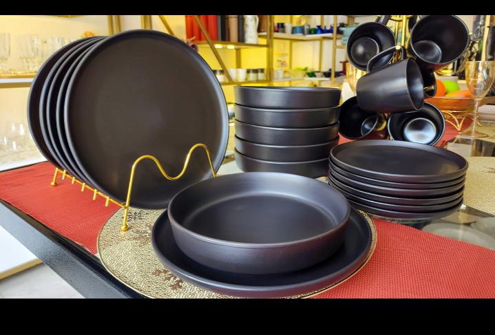 Classy Black dinner set contains 6 Dinner plates, 6 side plates, 6 bowls and 6cups .